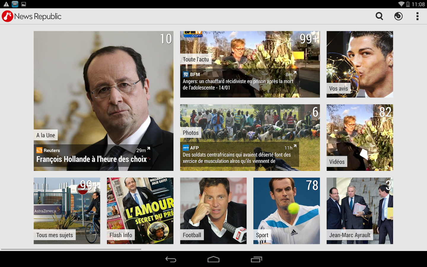 تطبيق News Republic - Actualités من أجمل تطبيقات الأندرويد لكي تكون مع الحدث من خلال آخر الأخبار من قنوات إحترافية في كل المجالات الرياضية والسياسية والإقتصادية والإخبارية والأحداث الموسيقية و باقي الميادين بالصوت والصورة والفيديو.