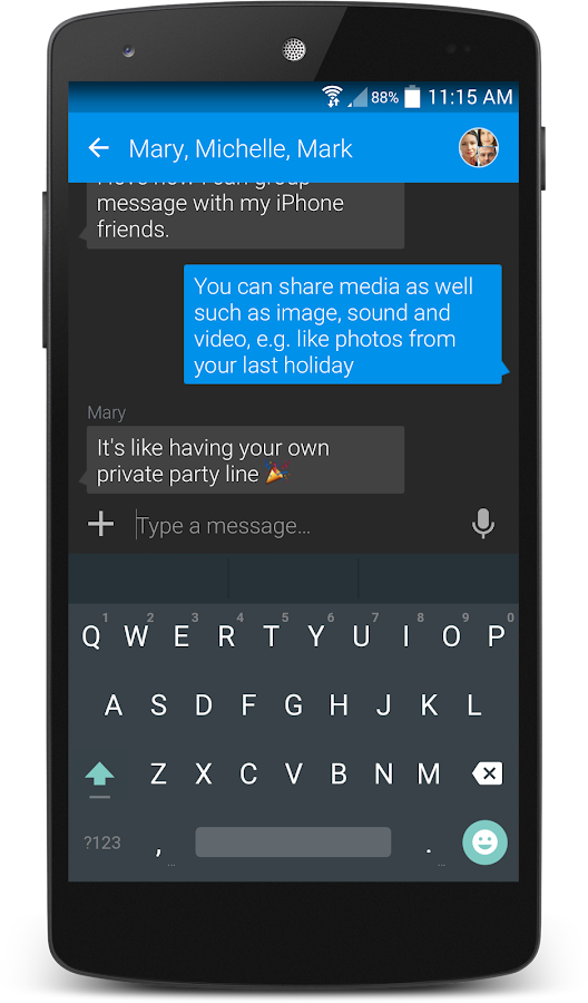 تطبيق Textra SMS من أجمل تطبيقات الأندرويد لإضفاء جمالية على الرسائل النصية القصيرة Sms من خلال العديد من التيمات بألوان زاهية وتصميم أنيق. كما يتوفر تطبيق Textra SMS على العديد من التأثيرات الجميلة كالرموز التعبيرية والصور وإبتسامات Gif يمكنك إضافتها في رسائلك Sms أو Mms كما يتميز التطبيق بالعديد من الوسائط كالرنات الموسيقية وأنماط الألوان.